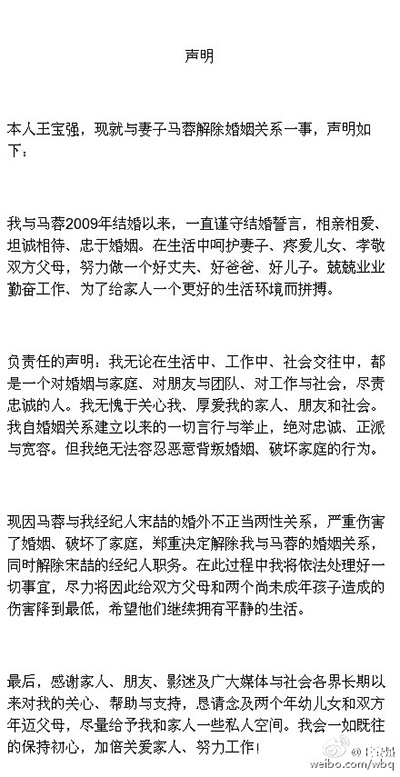 8月14號凌晨,王寶強(qiáng)發(fā)布了一條與妻子馬蓉離婚微博,其實(shí)娛樂圈中明星公開分手或離婚的戲碼也不少,但王寶強(qiáng)這一公開自己離婚的微博卻引起了軒然大波,瞬間引起25萬跟評,原因或許就在于王寶強(qiáng)在微博中直爆離婚內(nèi)幕、直斥妻子的惡劣行為,言語義正言辭。