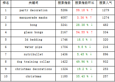 總結(jié):派對裝飾用品、化妝舞會面具、玻璃煙槍、3D床上用品熱度較高。